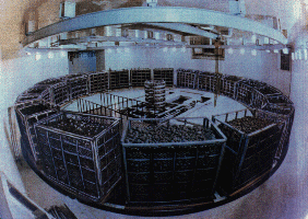 遮蔽用のコンクリート壁を斜線で表してあり、照射室はコンクリート壁の迷路の中にある。照射室の真ん中に円筒状線源(A)があり、円筒状の枠にステンレス製のカプセルに入った60Co線源が収納されている。円筒状線源(A)はプール(B)の中に格納されており、照射する時だけプール(B)の水面上に出てきて、円形の照射コンベア(D)で搬送されるコンテナに入った馬鈴薯を照射する。コンテナは100x160x130cmの金網製であり、1つのコンテナに1.5トンの馬鈴薯が入る。なお、照射の様子はのぞき窓(C)及び照射室に設置されたテレビカメラ通して操作室から見ることができる。照射室内の様子を図2に示す。