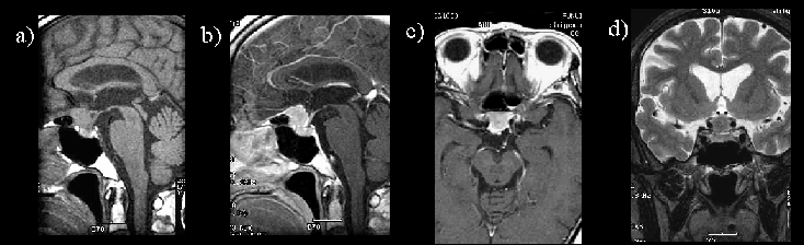 鞍内から鞍上部前方にかけて、均一に造影される腫瘤を認める。MRI T1強調画像では、脳実質と等信号で、T2強調画像では、比較的高信号を示している。造影後T1強調画像(矢状断)では、腫瘤の前縁より前頭蓋底の硬膜が染まっている。また腫瘍と下垂体茎の間に視神経交差が描出されている。