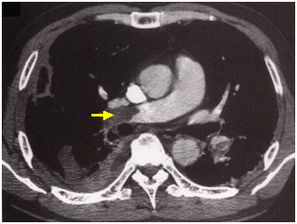 図1 肺血栓塞栓症。胸部造影エックス線CT。右肺動脈に閉塞が認められる(矢印)。(原論文3より引用)