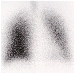 つまり肺動脈の血栓塞栓部位に一致してその領域の血流障害を認めるが、同じ領域の換気は異常なく、このような換気・血流のミスマッチから肺血栓塞栓症と診断される。シンチグラフィーは肺血栓塞栓症の治療効果の判定、経過観察に有用である。