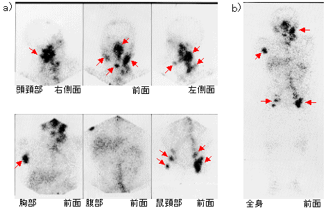 図1 悪性リンパ腫患者の67Gaシンチグラム 1a)頭頸部の前面、左右側面、および胸部、腹部、鼠径部の前面、1b)全身の前面 (原論文1より引用)
