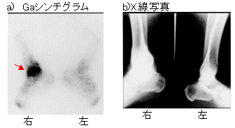 右脛骨遠位端から足関節部に67Gaの強い集積を認められ(2a)、同部位のX線写真では、脛骨遠位端に骨髄炎像と足関節腔の狭小化を認められる(2b)。患者は右足関節部の痛みと熱感を訴えている。