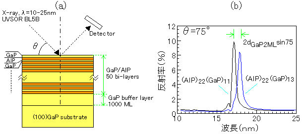 図2 (a)(AlP)/(GaP)多層膜構造、(b)X線反射スペクトルの測定値。(原論文1より引用。 Reproduced from Data source 1 copyrighted in 1997 by Elsevier Science, and with kind permission from the copyrighter.)