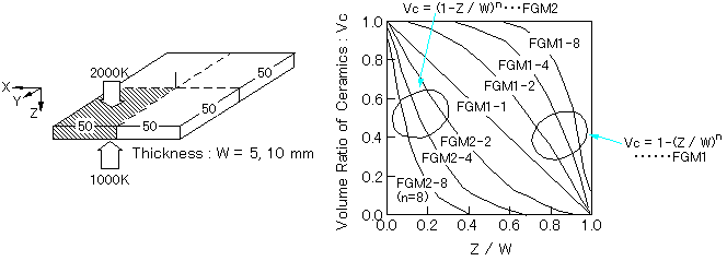 図1 Geometry of 3D analysis for PSZ/SUS304 FGM and compositional distribution along thickness direction for PSZ/SUS304 FGM(原論文1より引用)