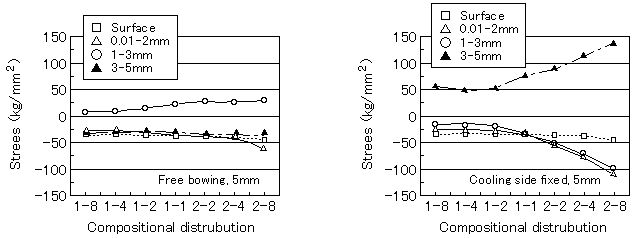 曲げ拘束がない場合は、加熱面、冷却面に圧縮応力、板厚中央に引張応力が発生し、曲げ拘束のある場合に比べて大幅に応力レベルは低下する。一方、曲げ拘束がある場合は、加熱表面の圧縮応力はほぼ一定で、最大圧縮応力は加熱面直下に発生し、SUS304成分が多くなり、その成分分布が急勾配になるほど大きくなる。PSZ成分が多い側では圧縮応力の成分依存の差がなくなり、冷却面には引張応力が発生することが明らかになった。