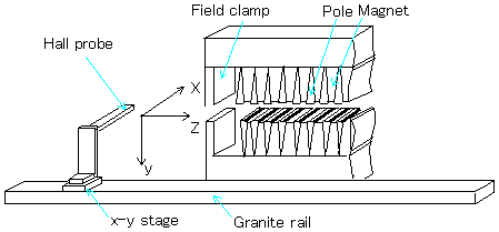 この方法そのものは極めて一般的な磁場分布の計測方法であるが、重要なことはアンジュレータの長さ約2mにわたりどのようにして充分なホールプローブ位置精度を確保するかである。ここでは、約2mにわたって位置精度を確保したいアンジュレータの長手方向については、充分に面精度のとれた大理石のレールの上をホールプローブが載った台車を移動させ、その位置を光学式リニアエンコーダを用いて計測している。比較的移動距離の短い断面方向についてはリニアアクチュエータによって2方向に移動可能になっている。リニアアクチュエータによってアンジュレータの中心軸上にホールプローブをセットして、長手方向に台車を走らせることにより長手方向の磁場分布を計測するものである。