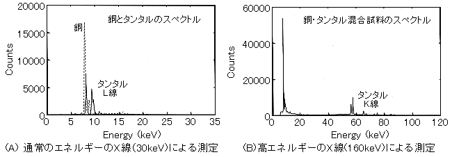 ¿Þ1¡¡·Ö¸÷XÀþ¥¹¥Ú¥¯¥È¥ë¤ÎÎã¡£¡¡È¾Æ³Âθ¡½Ð´ï¤òÍѤ¤¤Æ»À²½Æ¼¡¦¶â°¥¿¥ó¥¿¥ëº®¹çÊ´Ëö¤«¤é¤Î·Ö¸÷XÀþ¥¹¥Ú¥¯¥È¥ë¤ò¬Äꤷ¤¿¡£´ÉÅ۵¤ò30kV¤Ë¤·¤¿¾ì¹ç(A:Ä̾ï¤Î¥¨¥Í¥ë¥®¡¼°è¤ÎXÀþÍøÍѤˤè¤ë¥¿¥ó¥¿¥ëLÀþʬÀÏ)¤ª¤è¤Ó160kV¤Ë¤·¤¿¾ì¹ç(B:¹â¥¨¥Í¥ë¥®¡¼XÀþÍøÍѤˤè¤ë¥¿¥ó¥¿¥ëKÀþʬÀÏ)¡£¡Ê¸¶ÏÀʸ2¤è¤ê°úÍÑ¡Ë