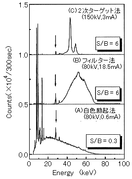 ¡¡¤³¤ì¤ËÂФ·¤Æ¥Õ¥£¥ë¥¿¡¼Ë¡¤ä2¼¡¥¿¡¼¥²¥Ã¥ÈË¡¤Î¤è¤¦¤Ê½àñ¿§²½¤µ¤ì¤¿XÀþ¤òÍѤ¤¤ÆÎ嵯¤¹¤ëÊýË¡¤Ç¤Ï¡¢¥è¥¦ÁÇ¤ÎÆÃÀÀþ(K¦ÁÀþ¡¢28.6keV)ÉÕ¶á¤Î¥Ð¥Ã¥¯¥°¥é¥¦¥ó¥É¤òÂçÉý¤Ë¸º¤é¤¹¤³¤È¤¬¤Ç¤¤¿¡£¤Ê¤ª¡¢Ä̾ï¤Î¥¨¥Í¥ë¥®¡¼¤ÎXÀþ¤òÍѤ¤¤ë¼Â¸³¤ÈÈæ³Ó¤¹¤ë¤È¡¢¥³¥ó¥×¥È¥ó»¶Í𤬶¯¤¯¡¢¤â¤È¤â¤È¤ÎÆþ¼ÍXÀþ¤è¤ê¤âÄ㤤¥¨¥Í¥ë¥®¡¼¤Î»¶ÍðXÀþ¤¬¥Ð¥Ã¥¯¥°¥é¥¦¥ó¥É¤È¤·¤Æ¸½¤ì¤ë¤³¤È¤¬Â¿¤¤¤Î¤Ç¡¢¤³¤ì¤ò¹Íθ¤ËÆþ¤ì¤ÆÂ¬Äê¤Î¾ò·ï¤ò·è¤á¤ë¤³¤È¤¬½ÅÍפǤ¢¤ë¡£