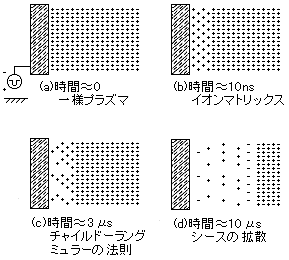 ¿Þ1¡¡½¾Íè¤Î¥¤¥ª¥óÃíÆþ(a)µÚ¤Ó(b)¤È¥×¥é¥º¥Þ¥¤¥ª¥óÃíÆþ(c)µÚ¤Ó(d)¤ÎÈæ³Ó¡£(a)½¾Íè¤Î¥¤¥ª¥óÃíÆþÊý¼°¡¢(b)¥Þ¥¹¥¯É¬Íס§¥¤¥ª¥ó¤¬Ã¼Éô¤Ç¥¹¥Ñ¥Ã¥¿¤òµ¯¤³¤¹¤¿¤á¡¢(c)¥×¥é¥º¥Þ¥¤¥ª¥óÃíÆþÊý¼°¡¢(d)¥Þ¥¹¥¯ÉÔÍס§¥¤¥ª¥ó¤¬Á´Êý°Ì¤«¤é¿âľ¤ËÆþ¼Í¤µ¤ì¤ë¤¿¤á¡£¡Ê¸¶ÏÀʸ1¤è¤ê°úÍÑ¡Ë