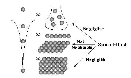 図1 Molecular assemblies in various states and their space effect: (a)in solution a macroscopic scale, (b)in the inclusion state on a molecular scale, and (c)in the solid state regardless of space.