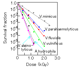図1 Radiation sensitivities of pathogenic vibrios and A. hydrophila in frozen shrimps(原論文2より引用)