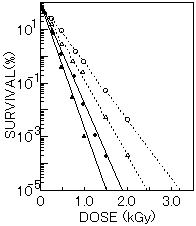 図2 Radiation sensitivity of S. typhimurium and S. enteritidis in frozen phosphate buffer and frozen shrimp homogenate.(原論文3より引用。 Reproduced from Journal of Food Safety, Vol.10, 175 - 180(1990), fig.1(p-178), D. P. Nerkar, J. R. Bandekar, ELIMINATION OF SALMONELLA FROM FROZEN SHRIMP BY GAMMA RAIATION; Copyright(1992) with kind permission from Kluwer Acadmic Publishers. )