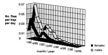 図1 Apparent Density of Wild Tsetse Flies on Unguja,Jan.'95 through Oct.'96(original fly density in Jozani forest before initiation of pre-release tsetse control operations: > 7 flies/trap/day)(原論文6より引用)