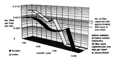 不妊虫放飼開始前に、あらかじめハエの密度を減らすため、牛に殺虫剤を散布し、またハエを誘殺する青色の粘着誘殺板を設置して、抑圧防除を行なった。ツェツェバエの大量飼育とガンマ線照射のための施設はタンザニアのタンガにあるツェツェバエ・トリパノソミア症研究所(TTRI)におかれ、ここで増殖され、成虫期に照射された不妊雄を飛行機でウングヤ島まで運び放飼した。1994年1月の放飼開始時には週15000頭の不妊雄が地上から放飼されたが、1995年8月から飛行機による放飼にきりかえられ、放飼数も次第に増加し、1996年後半には週10万頭近くの放飼が行われた。島内の放飼地域も、初めは生息密度の高い南部から始められ、放飼数がふえ効果があがるにしたがって、より密度の低い中部、北部へと広げられ、最終的には全域に放飼された。その結果、図1及び図2に示すように、トラップに誘殺される野生のハエの数は次第に減少し、1996年9月にはゼロとなり、その後もゼロが続いている。