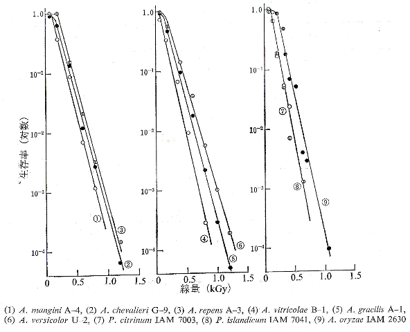 穀類や香辛料等の乾燥食品は水分含量が12〜15%であるがカビなどの糸状菌により腐敗することが多く、食品によってはアフラトキシンやオクラトキシン、ステリグマトシスチンなどの発癌性カビ毒などで汚染することもある。米などの穀類に発生してくる糸状菌類は好浸透圧性のAspergillus restrictus群、A. glaucus群、A. versicolorなどであり、香辛料の黒コショウやターメリック、赤トウガラシなどにはA. restrictus群、A. glaucus群、A. flavus群、A. fumigatus群、A. niger群、Penicillium属などの糸状菌が多く検出される。Aspergillus属の無性胞子のconidiaは放射線に感受性が高く、図1に示すように菌種間の差も小さく0.067M燐酸緩衝液中では1.5kGyで殺菌される。