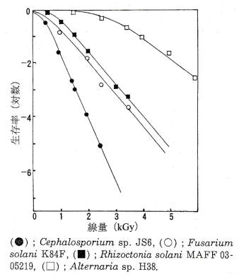 これらの植物寄生性糸状菌類の0.067M燐酸緩衝液中での放射線感受性は表2に示すとおりであり、D10値はA. oryzaeの0.20kGyに比べ0.30〜1.6kGyと値が大きく放射線に耐性である。植物病原性糸状菌もD10値は燐酸緩衝液中で0.75〜1.10kGyと放射線に耐性である。Gibellela fujikuroiの場合、燐酸緩衝液と乾燥下で放射線感受性を比較すると、乾燥下では生存曲線の肩が大きくなるがD10値は燐酸緩衝液中で0.75kGyが乾燥下では0.90kGyになる程度で放射線耐性はそれほど増加しない。植物寄生性または病原性の糸状菌類は生存曲線の肩が大きいものが多く、図2に示すように乾燥下では殺菌線量が5kGy以上のものが多い。胞子と菌糸の放射線感受性も大差がなく、胞子の方が若干耐性が強いものが多い。植物寄生性糸状菌類の中ではAlternariaやHelminthosporium、Cladosporium、Blastmyces、Dimorphoraなどが放射線に耐性である。これらの植物寄生性糸状菌類や病原性糸状菌類の殺菌線量は10kGy必要であろう。しかし、放射線抵抗性菌のAureobasidumやTricosporon oryzaeも植物寄生性糸状菌に属し、殺菌線量は20〜30kGy必要である。植物病原菌の多くは糸状菌であり、細菌類には植物病原菌は少なく植物病原性のPseudomonasやErwiniaなどの細菌類は5kGy以下で殺菌される。