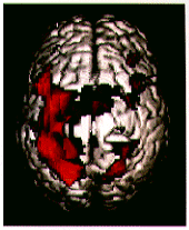 図1 左手複雑指手運動負荷を用いたfMRI。頭頂から見た大脳皮質三次元像と賦活部位を合成。複雑指手運動に伴う右一次感覚性運動野、両側前運動野、補足運動野の賦活が確認される。