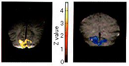 図3 光刺激を用いた幼児のfMRI。生後7週の幼児(左図)では光刺激に伴い後頭葉視覚領野に信号上昇が認められるが、生後8週の幼児(右図)は信号低下が生じる。(原論文1より引用)