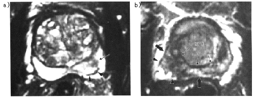 MRI:躯幹コイルによる撮像ではstage B1(片葉内に限局する最大径1.5cm以下の腫瘍)以下の癌の診断は困難とされ、Pelvic Phased Arrayコイルと経直腸コイルの組み合わせによる高解像MRIにより、前立腺病変の診断率の向上が図られている。T1強調像では均一、T2強調像では中心域と移行域が低信号で両者を区別できないので、これらを併せて内腺inner glandと呼び、それを取り囲むように後方から外側に均一な高信号の辺縁域が認められる。前立腺肥大は腺組織と間質が様々な割合で肥大するが、腺組織優位型はT2強調像で多数の腺過形成結節がみられ(図2a)、Gd-DTPA等による造影MRIで間質が網目状に造影される。間質優位型の場合は均一に造影される。間質優位型では抗男性ホルモン剤の治療効果はあまりなく、MRIは治療法の選択に有用である。