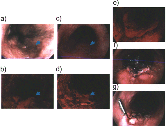 図2 食道内視鏡検査 a)食道静脈瘤の上に不正な粘膜を認める(矢印)。b)色素散布併用の食道内視鏡検査により、病変部が食道静脈瘤上にヨード不染域として認められる(矢印)。c)通常の食道内視鏡検査では、矢印で示される領域に僅かな不整粘膜を認めるのみである(矢印)。d)色素散布併用の食道内視鏡検査により、病変部がヨード不染域として多数認められる(矢印)。 e)色素散布併用の食道内視鏡検査により2/3周におよぶヨード不染域を認める(矢印)。f)EMRを行うが出血。g)クリップによる止血。しかし、ヨード不染域は残存する。abは粘膜上皮癌、cdは粘膜固有層癌、efgは粘膜筋板に浸潤の及ぶ癌であり、いずれも放射線治療が適応される。