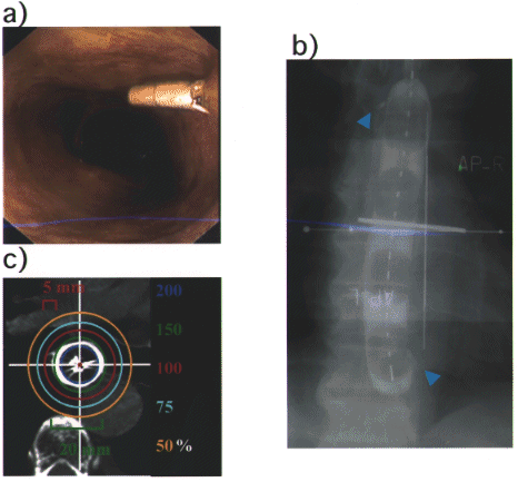 図3 二重バルーンアプリケータ法による食道腔内照射 a)内視鏡検査による金属マーカの装着 b)二重バルーンアプリケータ挿入と治療計画の照準写真 病変の上下に金属マーカが挿入されているのが容易に確認できる(矢印)。 c)腔内照射による線量分布 二重バルーンアプリケータを使用することにより、食道粘膜に均等に照射が可能である。(原論文1より引用)