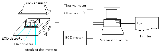 フルエンス測定に対する影響因子は多いため、出来得るならば熱量計等別の計測方法との比較により、測定の信頼性をチェックすることが望ましい。例として、図3に示すように、電子ビームを走査して得られる大気中の照射場を、コンベアを用いて同時に熱量計、電子流密度測定器及び積層したフィルム線量計を移動する方法がある。
