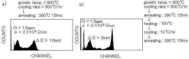 THM(Travering Heater Method)により成長させたCdTe結晶にさらに熱処理を施して得られるCdTe素子のエネルギースペクトル(241Amγ線源)を図1に示す。抵抗は共に2×109Ωcmである。成長を終了し急冷後に380℃でアニールして高抵抗化した結晶から得られるスペクトルa)は、もう一度成長温度から徐冷し直して同じ380℃でアニールすると、b)のように改善される。