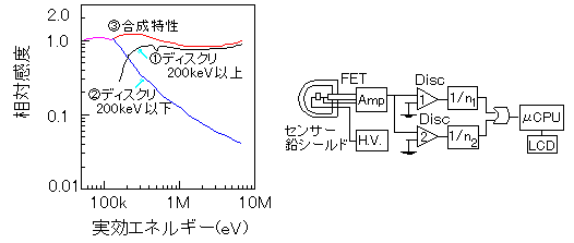 光子の計測による線量計測においては、エックス線、γ線の光子数と線量とのエネルギー依存性に合致するように、まず検出器の量子効率のエネルギー応答特性を合わせる。エックス線領域の感度を最適化するためにPbのシールドを配置するとともに200keVをディスクリレベルとして高エネルギーと低エネルギーに分離してこれらから得られる特性を合成することによって60keVから6MeVまでのエックス線、γ線を±20%の誤差で測定することが出来る。