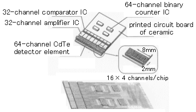 株式会社島津製作所はマルチチャンネルCdTe放射線検出器を高密度実装技術を用いてQR(Quantum Radiography)装置を開発し、神戸大学医学部にて胸部の臨床撮影を行い従来のエックス線フィルム式と比較している。その結果、全体的に画質が鮮明であり、特に肺野及び横隔膜・心臓に重なる部位での画質に優れていた。使用している検出器は幅32mm×全長55mmのセラミック配線基板上に64×4=256チャンネルの検出器モジュールとして構成されている。その概略図と写真を図3に示す。QR装置ではこの検出器モジュールを12個並べて、768チャンネル×4列のマルチラインセンサーユニットを形成している。セラミック基板の端から、第1列目に16×4チャンネル(チャンネルサイズ0.5mm角)のCdTe素子が4個並び、第2列目、第3列目には、それぞれ32チャンネル分を集積した8個のアンプIC、コンパレータICが並んでいる。そして中央付近には、64チャンネル分を集積した4個のカウンタICが配備されている。これらのICの実装はハンダバンプ等の高密度技術が活かされている。
