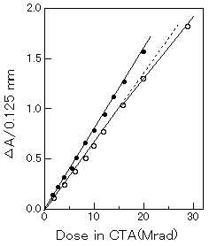 既に、CTA線量計は放射線加工レベルの実用線量計として、特に中、高エネルギー電子線照射の場合に広く用いられている。これは広い範囲で線量と照射による吸光度変化量が正比例すること、温度、湿度の影響を受けにくい事などの優れた特性を持ち、線量分布等の測定が容易に可能なテープ状であるためと考えられる。現在、イオン照射に対する応答特性も明らかにされつつあり、更に利用範囲が拡がることになろう。