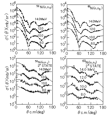 他に、中性子散乱断面積の測定では、中性子モニターを使用することによって、エネルギーの関数としての中性子検出効率の相対値が分かれば良く、Y.Yamanouti の21.5MeVでの中性子散乱断面積の測定では、反応断面積が知られているT(d,n)4He反応の角分布を実際に測定することによってエネルギーに対する相対検出効率を求め、32Sの中性子散乱断面積を得た(原論文3)。図2にn-p散乱への規格化によって得られた58Ni,60Niの中性子散乱断面積を示す。