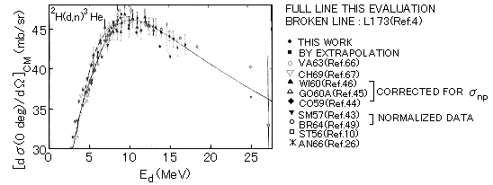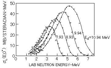 0゜方向の実験室系の微分断面積は、T(p,n)3He反応では陽子エネルギー4MeVで99.5mb/srである。 D(d,n)3He 反応では重陽子エネルギー11MeVで99.1mb/srであり, T(d,n)4He反応では6-16.5MeVの範囲にわたって約26mb/srになる。図1にD(d,n)3He 反応の重陽子エネルギーに対する重心系での0゜方向の微分断面積の変化を示す。