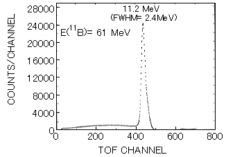 図3に入射 11Bエネルギー61MeV において、0゜方向に発生する11.2MeV 中性子のスペクトルを示す。0゜方向の微分断面積は中性子エネルギー11MeV付近で最も大きく実験室系で180mb/sr に達する。