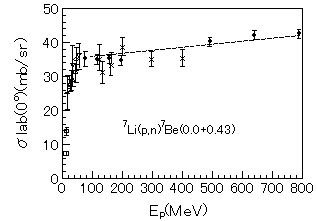 リチウム放射化法は7Li(p,n)7Be反応において、7Beの基底状態と0.43MeV励起状態への微分断面積を角度積分した全断面積が、7Beの放射化断面積に等しいという仮定に基ずく。この微分断面積を角度積分した全断面積を、リチウム放射化法で得た全断面積に規格化して求めた0゜方向の微分断面積を図1に示す。この反応の微分断面積は0゜方向が最大であり、0゜での微分断面積は30-800MeV の広いエネルギー範囲にわたって実験室系で〜35mb/sr と大きく、略一定である。