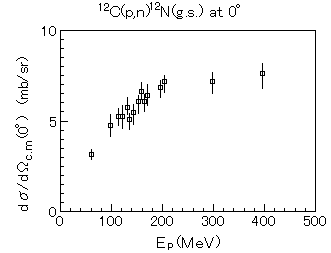 これらの測定データはロスアラモス国立研究所の結果と矛盾しないデータであり、図2にこの測定で得られた12C(p,n)12N反応の、エネルギーに対する0゜方向の微分断面積を他の測定結果と共に示す。