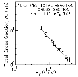 TRIUMF加速器研究所のJ.D'Auriaらは、インディアナ大学のサイクロトロン中性子飛行時間実験施設を用いて、60,135,160 および190MeVのエネルギーにおいて、さらにTRIUMF研究所のサイクロトロンを用いて、190-480MeVのエネルギー範囲において7Li(p,n)7Be(g.s.+0.43MeV)反応の全断面積を、7Beが電子捕獲による崩壊をする際に生ずる0.478MeVのガンマ線を観測することによって測定した。7Be放射能を含む照射ターゲットはGe(Li)検出器を用いて数ヵ月にわたり計測された。