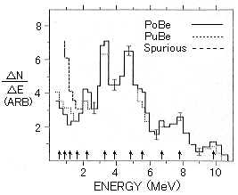 図3にAm-α-Be中性子源のスペクトルを示す。このスペクトルで3.5, 4.7, 5.8, 7.6 および9.7MeV付近にピークが見られるが、これらのピークは210Po、 226Ra、 239Pu ならびに241Am中性子源にほぼ共通に現われている。中性子スペクトルの計算の結果3.5、 4.7と 5.8MeVのピークは9Be(α,n)12C反応における12Cの4.43MeV励起状態を経由する過程からの中性子の寄与、7.6と9.7MeVのピークは12Cの基底状態を経由する過程からの中性子の寄与によるものであることが分かった。