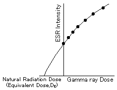 年代測定を行う際には、ESRの信号強度から自然放射線による鉱物の被曝線量を求める。この時には、被曝線量あたりの信号の生成効率を試料毎に求めるため、人為γ線照射を行う。図1のように、数点の被曝線量に対して信号強度を測定し、信号強度0の点まで外挿することによって、被曝線量が算出される。被曝線量が小さければ直線を当てはめるが、格子欠陥の生成モデルから考えて、信号の生成は一般には飽和曲線に従うと考えられている。