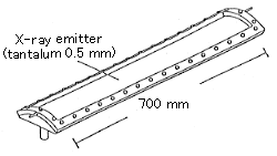 電子加速器は日新ハイボルテージ(NHV)社製5MeV、30mAのコッククロフトワルトン型で、ビーム走査幅140cmである。X線発生用ターゲットは原研とNHV社との共同研究で開発した水冷式湾曲型を採用した。このターゲットはX線発生体として厚さ1mm、長さ160cm、幅15cmのタンタル板を用いている。