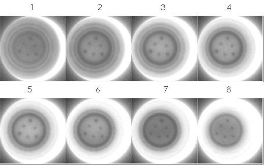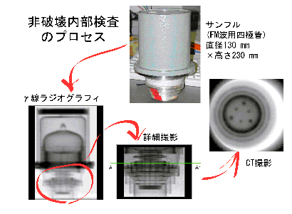 本手法を用いて行う非破壊検査の流れを図2に示す。まず、被検査体を一度大まかに撮影し、詳細を知りたい部位について詳細なラジオグラフィを行う。さらに、必要であればその部分の断層撮影を行う。図3は、直径約13 cmのセラミクス、および金属製のFM波用四極管の電極部分を詳細に撮影したCT画像の一例である。内部の金属製コンタクトピンやグリッドプレート等が鮮明に観測された。
